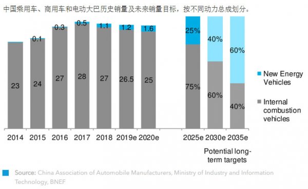 新规划将新能源新车新车销量占比目标上调至25%。假设新车总销量保持在2018年的水平,达到2800万,则2025年新能源汽车销量需达到700万。在上一次提出的汽车产业规划中,新能源汽车销量占比目标为20%。BNEF 2019年的新能源汽车展望报告预测,2025年中国新能源汽车新车销量占比略低于20%。